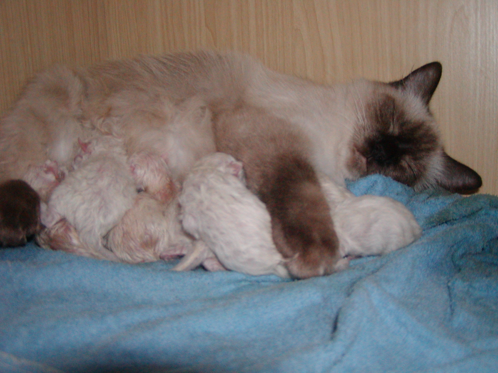 É un ottima mamma attenta e scrupolosa che sceglie per i suoi cuccioli sempre il posto più tranquillo e protetto della casa (nella foto in un ripiano dell'armadio con i suoi piccoli di 2 giorni). É la capostipite dell'allevamento, da lei sono nati la maggior parte dei nostri gatti. A loro ha trasmesso il suo bel carattere, la sua salute e la sua bellezza, aiutata anche dai suoi ottimi “mariti”.